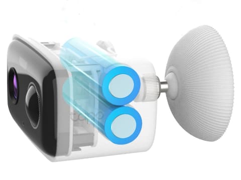 人物を検知して識別するAIを採用。カメラの撮影エリア、または指定したエリア内に人が入ってきた場合は、アプリを通じてユーザーに知らせる。また、カメラ本体にマイクとスピーカーを内蔵し、アプリの画面越しで外にいる相手と会話できる。