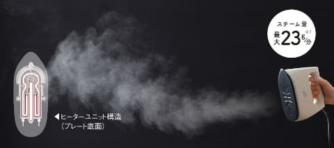 スチーム量は、約10g/分か約23g/分で切り替えられ、スチーム連続使用可能時間は最長約10分。アイロンプレートの温度は100/140/160℃の3段階で選べるため、デリケートな素材から厚手の衣類まで幅広く対応する。