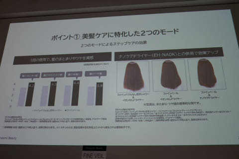 プレシャンプー、ヘアケアの2ステップによって、1回の使用で髪のまとまりやツヤを実感できたことが確認されている。また、同社のナノケアドライヤー(EH-NA0K)との併用により、さらに効果がアップするとしている。