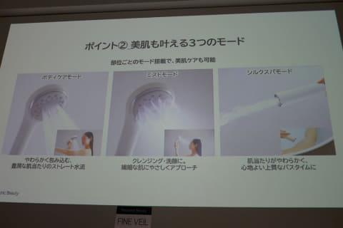 ヘアケア以外にも美肌ケアが可能な3モードを用意。クレンジングや洗顔に適した「ミストモード」、身体をやわらかく包み込むような「ボディケアモード」、ファインバブルが含まれたお湯に浸かれる「シルクスパモード」を備えている。