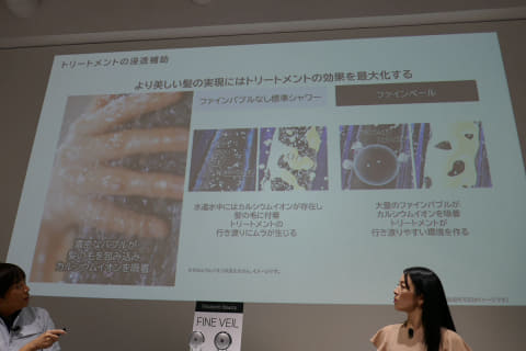 「ヘアケアモード」は柔らかい水流で髪を包むように洗い流す。また、トリートメントの浸透を妨げる要因のひとつである水道水中のカルシウムイオンをウルトラファインバブルが吸着することによって、トリートメントの浸透を補助するという。なお、ウルトラファインバブルの濃度が高ければ高いほど、この効果が高まることも実証している。