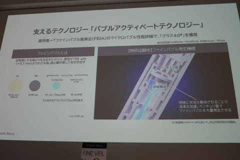 独自技術により大量のファインバブルを発生させる点が特徴。ファインバブル産業会(FBIA)のマイクロバブル性能評価で、家庭用シャワーヘッドでは業界唯一となる高濃度な「クラス4d」を獲得している。クラス4dは、気泡濃度数が10,000~100,000/ml、気泡径が10~100μmとなっている。