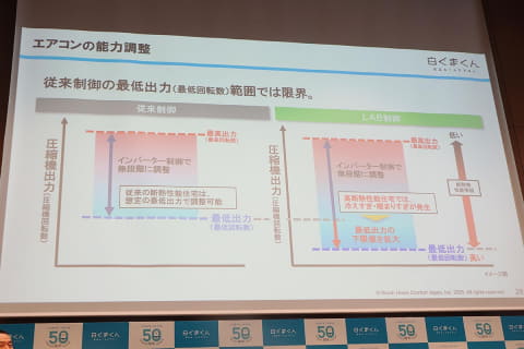 新機能のLAB(Linear Adjusted Boundless control)制御は、安定時に、住宅断熱性能や、外気温度、部屋の状況など、節電効果が期待できる環境と判断した場合に、エアコンの圧縮機を細かく制御することで低出力へ自動で切り替えて、継続的に暖房と冷房を行なう。運転と停止の頻度を抑えることで室内温度と湿度を安定させ、節電と快適さを両立させるという。