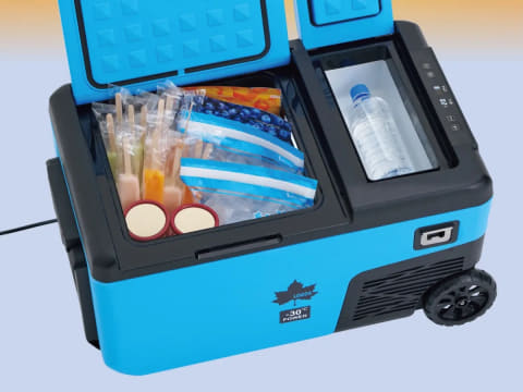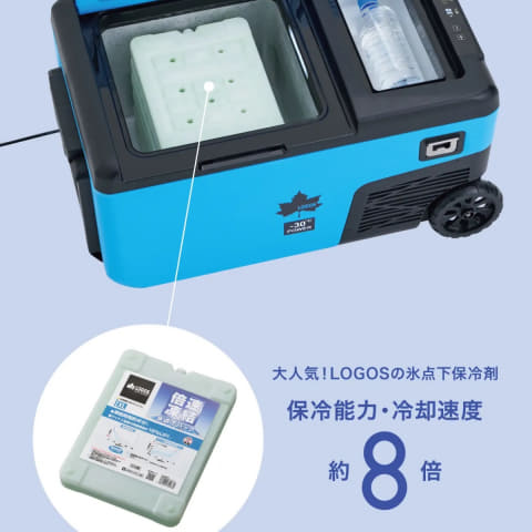2つの荷室を備えたホイール付きポータブル冷凍冷蔵庫。ロゴス史上最冷となる-30℃まで設定可能で、ロゴスの保冷剤「氷点下パック」を凍結させられるほか、外気温36℃の炎天下でも庫内温度を氷点下でキープでき、アイスや氷の保冷が可能としている。