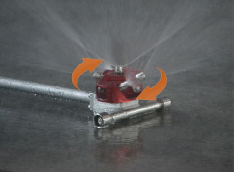 「アクアサイクロン」は、先端のノズルは高さ90mmの薄型設計のため、車両下部に差し込める。また、回転するノズルにより、50L/分という少ない水量で広範囲に放水でき、LIBを効率的に冷却。熱暴走や再燃のリスクを低減する。