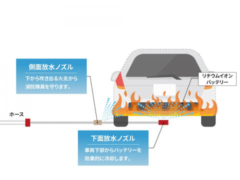 そのほか、2,250mmの長いノズルのため、車両に近づかず安全な位置から設置可能。また、側面放水ノズルを備え、車両の下から吹き出る火炎から消防隊員を守るとする。