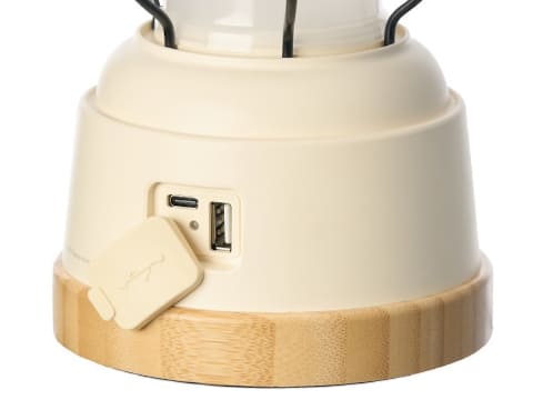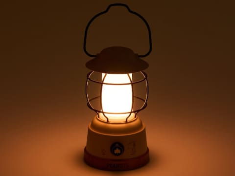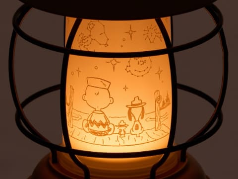 ランタンのグローブ(ホヤ)には、スヌーピーと仲間たちが夜空を見上げるイラストが描かれ、光を灯すと浮かび上がり、温もりのある雰囲気を演出する。また、ボディには竹集成材を使用し、自然な手触りと温かみのある見た目を実現している。