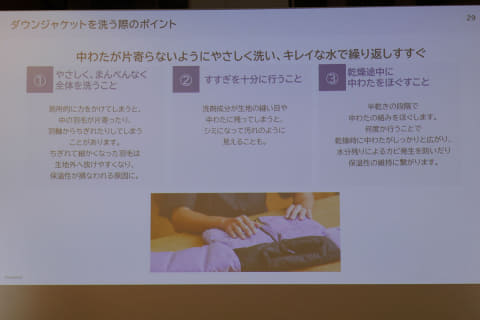 ダウンジャケットを洗う際に最も気を付けたいのが「中わたが片寄らないようにすること」。中わたが片寄ると、中わたが少ない部分から風が通って防寒性能が落ちてしまうという。そのため、局所的に力を加えたり絞ったりするのはNG。やさしくまんべんなく洗うようにしたい。
