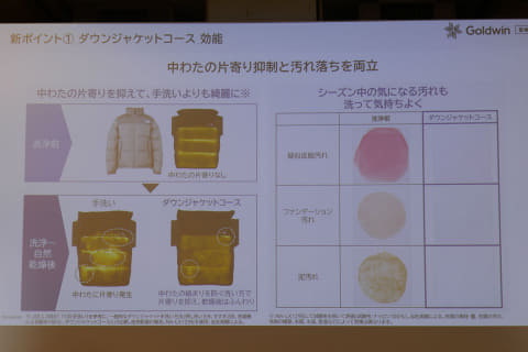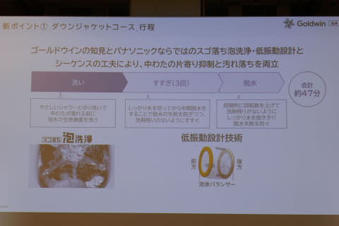 同コースでは、中わたが濡れた状態で力がかかると片寄ってしまうことと、ダウンジャケットは中わたまでは汚れないというゴールドウインの知見を活かし、泡立てた洗剤液をやさしいシャワーで流しかけ、中わたが濡れる前に表面を洗う。さらにドラムを回転させない「ゆり洗い」でやさしく洗浄したのち、終盤には強いシャワーを短時間かけてしっかりと洗い上げる。