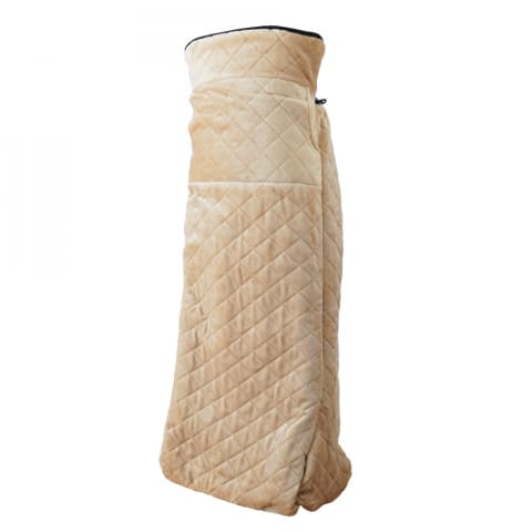 寝袋のように足を入れて使用する「着るこたつ」。着たまま足を出せる設計のため、こたつで温まりながら家事などができるという。