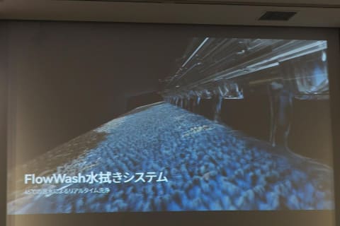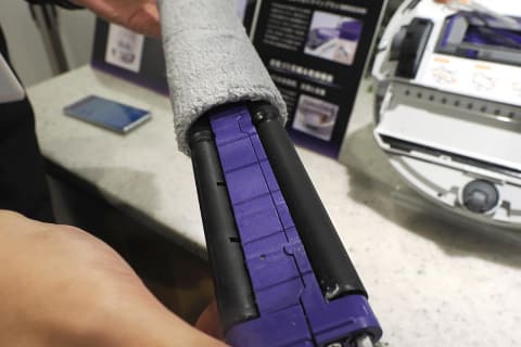 毎分110回転する「クローラーモップ」を備え、約45℃の温水と約12N(約1.2kg)の強い圧力で汚れに対処する。モップは円筒ではなく平らな面を広くとっており、ローラーよりも16倍という広い接地面積で床を掃除できる。