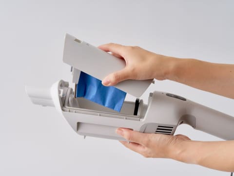 紙パック式を採用。紙パックのサイズと風路のバランスを最適化し、ごみがたまってきても吸引力が落ちにくく、吸引維持率約95%を実現したとする。ごみ捨てレバーを引くだけで紙パックに触れずに捨てられる「触れずにポイ」機構を採用した。紙パックは1枚で3カ月使用でき、交換パックはシロカオンラインストア本店で購入できる。