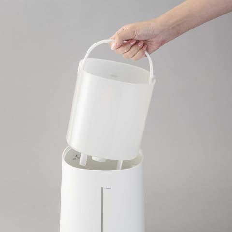 ふたを開けずに上から直接注げる「上部給水」に加え、タンクを外してシンクなどで水を入れられる「着脱給水」にも対応する超音波式加湿器。使う場所や状況に合わせて2通りの給水方法を選べる。ハンドル付きタンクで持ち運びもラクに行なえる。