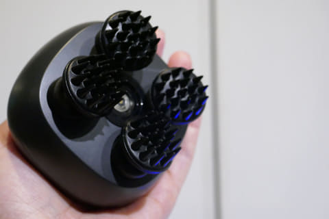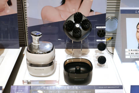 マッサージ機器の体感を応用した頭皮ケア家電「ドクターエア EMSスカルプスパ BSC-01」は11月19日発売で、価格は13,750円。約230gの軽量設計で、腕を上げ続けることになる頭皮ケアでも疲れにくいという。