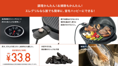 電気代は1時間当たり約33.8円と、木炭を燃料とするバーベキューグリルやガスボンベ式調理器具より低コストとしている。