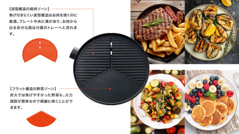 プレートは、波型とフラットの2つのゾーンに分かれた独自構造を採用。波型ゾーンの中央には溝があり、お肉の余分な脂が付属のトレーに流れるため、焼肉をヘルシーに調理できる。フラットゾーンでは、野菜を焼けるほか、ホットケーキなども楽しめる。