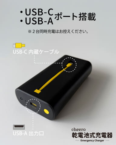 乾電池式スマホ充電器 USB-Cケーブル内蔵で緊急時も安心