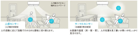 デュアルセンサーを用いた「AI自動快適運転」を搭載。人感センサーが人の動きを、サーマルセンサーが人の位置や壁・床温度の変化を検知することで、AIが自動で快適な運転を行なう。また、風向きを自動調整する「おまかせセンサー気流」や「風あて・風よけ運転」により、冷えすぎや風が当たることによる不快感を軽減する。