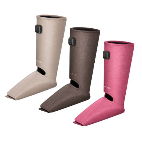 いずれも片足用のフットケア家電。「MYTREX RAKUNO LITE」は外出先でも手軽に使えるコンパクト設計を採用する。薄さ約2mmのスリムなボディに本格エアポンプを搭載。7つの独自ポンプがふくらはぎを刺激する。エアーレベルは5段階で調整が可能。折りたためるため、旅行などにも持ち運べる。