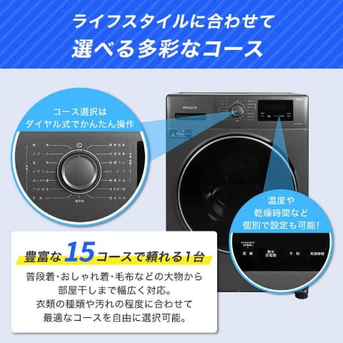 15種類の洗濯コースを備え、衣類の種類や汚れ具合に合わせて選択できる。標準、スピード、つけおき、おしゃれ着など多彩なコースに加え、温水洗浄機能を搭載。10℃、20℃、30℃、40℃、60℃から選べる。