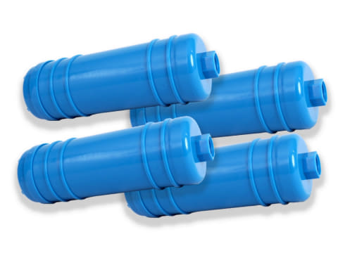本製品は、この水シミZERO専用のフィルタータンク。フィルター寿命が来た際に、タンクごと交換するだけで再び新品同様の純水精製能力がよみがえる。なお、性能低下を防ぐため、4本すべてのタンクを同時に交換することが必須。
