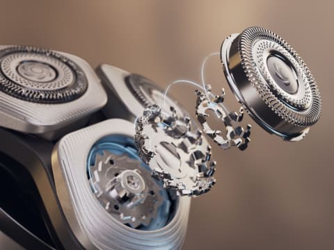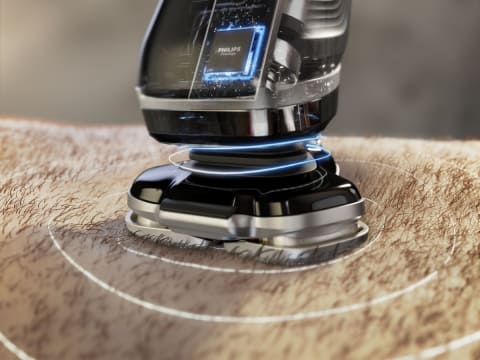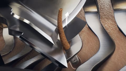 薄くなった外刃と、スーパーリフト&カットテクノロジーにより、肌の下-0.08mmの深剃りが可能。1枚目のリフト刃がヒゲを引き上げ、2枚目のカット刃が深剃りを行なう。毎分150,000回カットする72枚の回転刃が、さまざまな方向に生えているヒゲを効率的に取り込んで深剃りする。