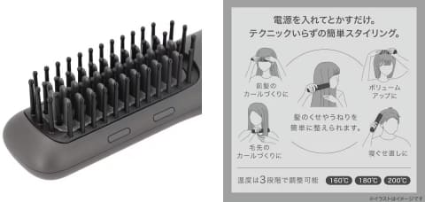 温度は160/180/200℃の3段階に調節可能。ヘアアイロンは長い髪もしっかり挟める約17×70mm(幅×長さ)のプレートを搭載。ヒートブラシは髪をとかすだけで簡単にスタイリングできる。