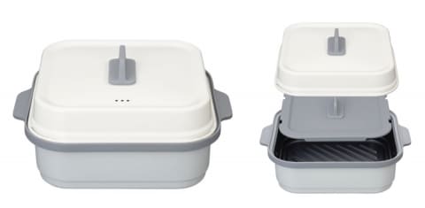 電子レンジで上下から同時に加熱できる「両面焼き構造」を採用した、レンジ専用グリル。レンジ加熱により発熱する内蓋を備え、食材を上からも加熱。上と下からのダブルのアプローチで、こんがりとした焼き目を付けられるという。
