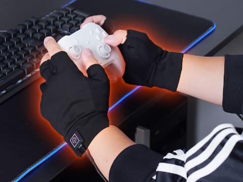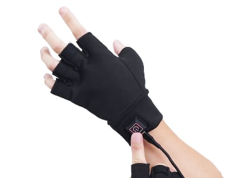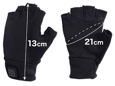 USB給電式のヒーターを手の甲全体に搭載した、伸縮性がある素材を使用した手袋。