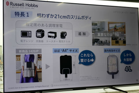 オーブンレンジや炊飯器といった「指定席」のある家電にプラスして置けるようにスリムさを重視。幅21cm、接地面積はほぼA4サイズに仕上げ、スペースの限られるキッチンにも置きやすくしている。