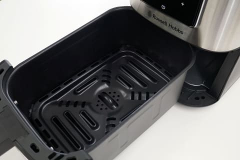 食材を入れるバスケットは奥行きのある縦長設計で、魚やさつまいもなどを切らずに丸ごと入れられる。コンパクトながら4Lの大容量を実現し、2品同時加熱など効率的な調理が可能。