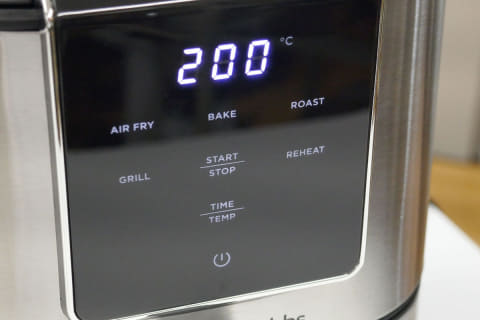 加熱時間と温度が自動で設定される5つのモードを用意。「AIR FRY」(20分/200℃)は冷凍フライドポテトに、「BAKE」(30分/160℃)はパウンドケーキに、「ROAST」(25分/180℃)はローストチキンや野菜に、「GRILL」(15分/200℃)は焼き魚に、「REHEAT」(6分/150℃)は総菜の温め直しに適しているという。このほか、手動で時間を1~60分、温度を60~200℃の範囲で調節可能。