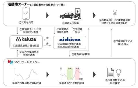 通常のV2Hは、太陽光発電でEVにためた電気を家庭用の電力としても使えるものだが、今回のV2Gの取り組みでは、Kaluzaがニチコンを通じて充放電器へ指示し、MCリテールエナジーが電力供給と買い取りも実施するもの。