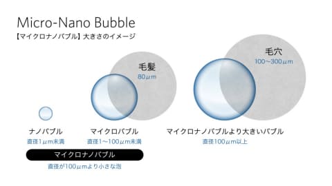 水流には直径100μm未満のマイクロバブル/ナノバブルが含まれており、コーム型ノズルから頭皮に直接アプローチ。微細な気泡が毛穴の奥までやさしく行き渡り、汚れや余計なトリートメント残留を取り除く。
