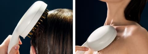 さらに、温水を流しながらコーム型ノズルを頭皮にやさしく当てることで、セルフマッサージが可能。肩や首周りにも使用でき、心地よい刺激が頭皮や上半身のこわばりをやさしく包み込むという。