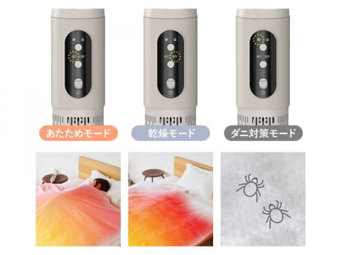 運転モードは、「あたためモード」「乾燥モード」「ダニ対策モード」の3種類を搭載。ふとんを10分で温められるほか、湿気を飛ばす乾燥やダニ対策にも対応する。