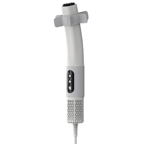 ホース不要でふとんに差し込むだけで使えるスティック型のふとん乾燥機。本体形状を見直し、掛布団と敷布団の間に効率的にジェット温風を送り込めるよう、角度をつけたデザインを採用した。