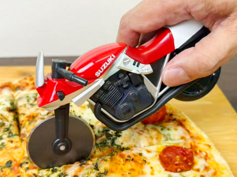 フェイスは、SUZUKIの名車のデザインをそのままピザカッターにした「KATANA型ピザカッター ピザカッターナ」に、新色のレッドを追加。ノリモノ雑貨ブランド「CAMSHOP.JP(キャムショップ)」にて、11月より予約販売を開始した。価格は2,640円。