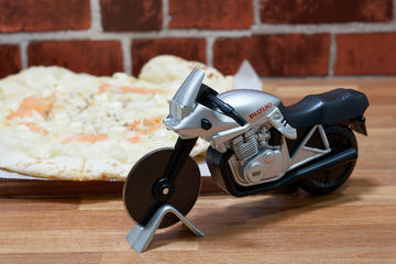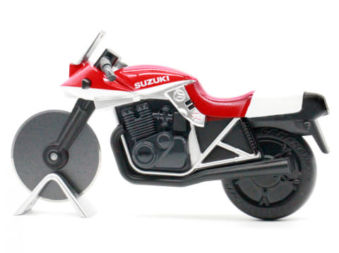 ピザカッターのモチーフとなったのは、1980年代初頭に登場した「SUZUKI GSX1100S KATANA」。日本刀をモチーフにした鋭く美しいデザインと、卓越した走行性能で世界中のライダーを魅了。直線的で無駄のないフォルム、切れ味のあるシルエットは、今なお多くのファンに語り継がれる伝説的なモデルとなった。