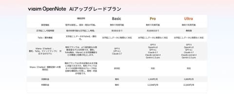 利用できるAI機能は「AIアップグレードプラン」により、内容が異なる。文字起こしできる時間は、無料のBasicプランが月600分まで。月額料金1,500円(年額料金1万2000円)のProプランが、月1,800分まで。月額3000円(年額料金2万2000円)がUltraプランは無制限となる。また利用できるAIモデルはProプラン、UltraプランにClaude Sonnet 4などが追加される。