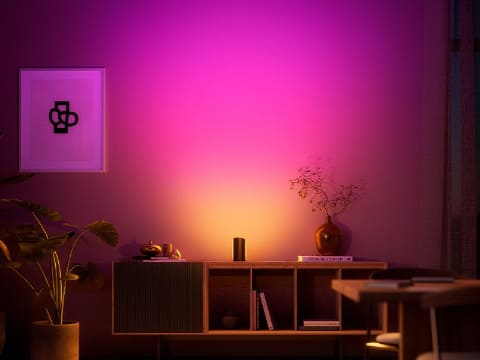 明るさと広角照射を兼ね備えた間接照明。ColorCast(カラーキャスト)テクノロジーにより、照明が壁から離れていても色が薄まることがなく、鮮やかな色彩を保つという。1台で複数の色をなめらかなグラデーションで表現できるとしている。