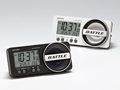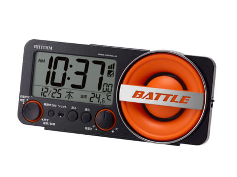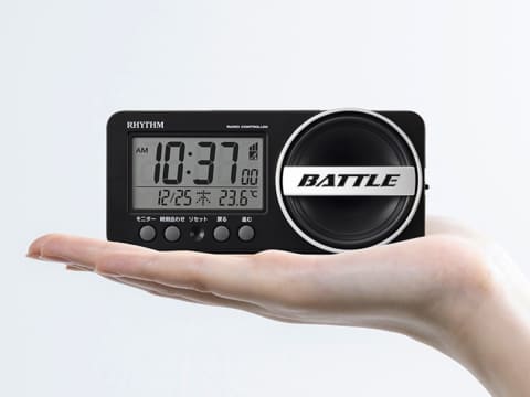 デザインは、リズム史上最大の音量を実現した大音量電波デジタルめざまし時計 「フィットウェーブバトル230」を踏襲。その特徴である前面スピーカーを強調し、大音量を感じさせるスタイリングに仕上げたという。