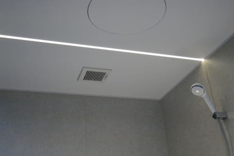 浴室の照明にはフラットラインLEDを採用。浴室内のボタンで調色可能で、シャワー中は白色、入浴中は電球色といったシーンごとの切り替えができる。