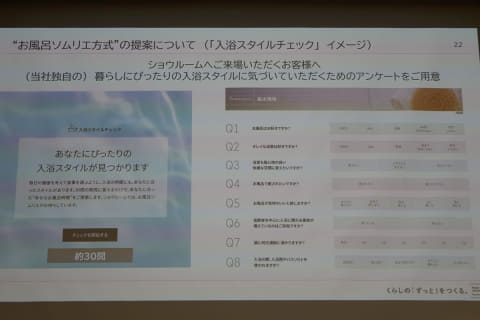 ショールームで新採用される「お風呂ソムリエ方式」の提案は、約30問のアンケートを通じて顧客に合った入浴スタイルを明確にし、最適なバスルームプランを案内する。お風呂ソムリエは同社ショールームアドバイザーのなかでも特別な研修を受けており、今後は社内資格制度を設け「お風呂ソムリエ(プロ)」を育成していくという。