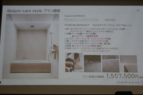 パナソニック ハウジングソリューションズは、全身のケアができるバスルーム「Beauty care style」を11月26日に発表。12月3日よりショールームでの提案を開始する。価格は1616サイズ、バリュー床タイプの「BVS6427」が1,557,500円(税別)。