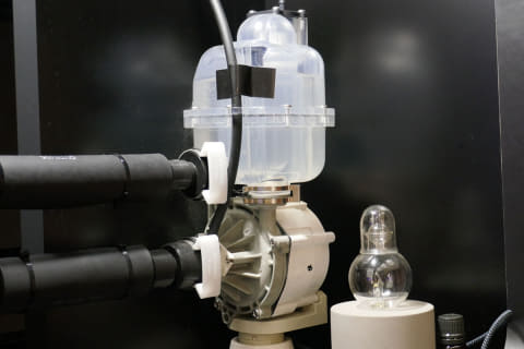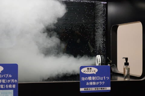 マイクロバブルの泡発生装置は浴槽に沿う形で配置されており、給湯口までの配管距離が短いことでバブルが濃密なままで出てくる。