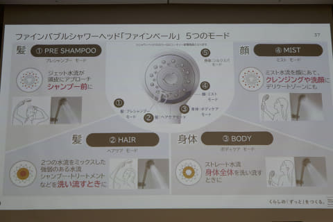 「ファインベール」は1μm未満の微細な泡、ウルトラファインバブルを含んだ水を吐出するシャワーヘッド。ヘアケアに特化した吐水モードを搭載する。