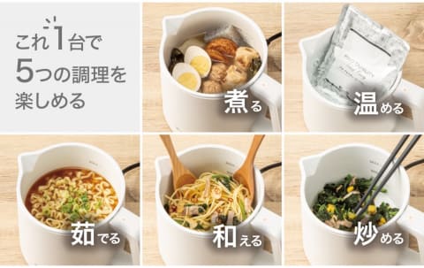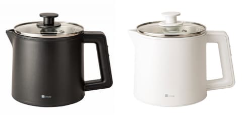 湯沸かしからレトルト食品の温め、鍋などの煮物料理に活用できる電気調理器具。従来品「1台3役の電気ケトルポット」の進化版として登場し、本体内側にコーティングを施したことで、炒める/和える調理も可能に。出力は「強(600W)/弱(300W)」の2段階に切り替えられる。