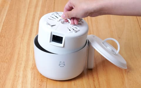 「ノラノラ KGDF25H」は丸みのある可愛いフォルムの3合炊きの炊飯器。1合なら最速約28分、3合でも約35分で炊き上がる(浸水・蒸らし時間除く)。付属の蒸しトレイを使えば、ご飯(1〜2合)を炊きながら、上段で温野菜などの蒸し料理を同時に作れる。