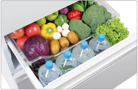野菜室を真ん中に配置。室内には、2Lのペットボトル最大4本を立てて収納できるうえ、小さな野菜であれば付属のバスケットに整理して保存できる。